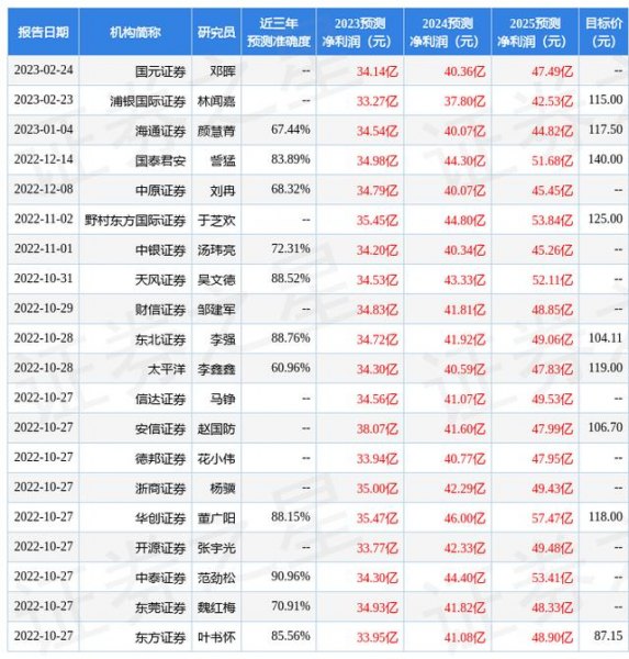 证券之星数据中心根据近三年发布的研报数据计算,中泰证券范劲松研究员团队对该股研究较为深入,近三年预测准确度均值高达90.96%,其预测2023年度归属净利润为盈利34.3亿,根据现价换算的预测PE为43.83。