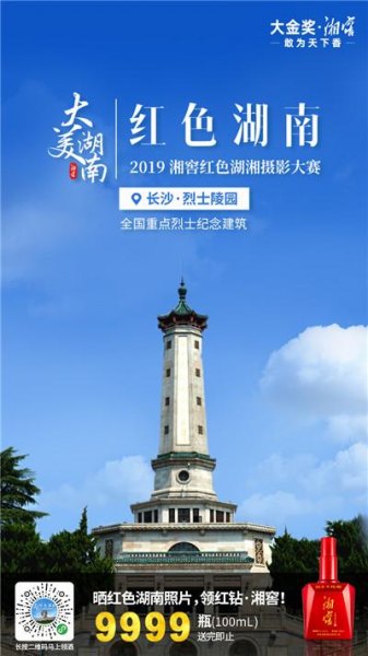 “大美·红色湖南2019湘窖红色湖湘摄影大赛”现已正式启动,无论你是专业摄影师、摄影发烧友,还是随手拍的手机党,只要你所拍的是和红色湖南有关的美图,都可以勇敢地晒出来。晒一张红色湖南美图,即可赢取价值160元的100mL红钻·湘窖一瓶,最终投票排行榜前200名还有大美·红色湖南纪念版T恤1件和500mL红钻·湘窖酒等丰厚大奖。