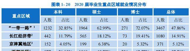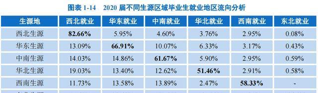 上表是兰州大学2020届毕业生不同生源地就业地区流向分布情况。从表中数据可知,经济最发达的华东地区,毕业生回到生源地就业的比例并不是最高的;最高的是西北地区。这说明学校地理位置对毕业生工作地理位置影响还是不小的。