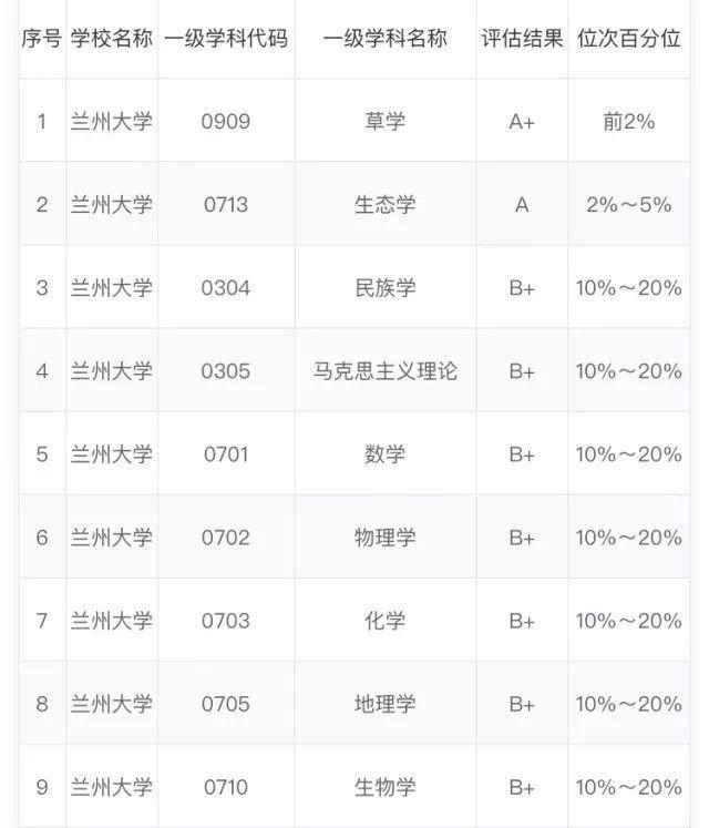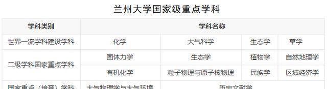 热门专业往往是高薪专业,高薪专业也往往是热门专业。当今的热门专业主要是计算机、金融、建筑、法学、外语、临床医学等等;当然,它们也是高薪专业。而这些专业,都不是兰州大学的优势专业。兰州大学的世界一流学科建设学科是:化学、大气科学、生态学、草学;二级学科国家重点学科是:固体力学、生态学、植物学、自然地理学、有机化学、粒子物理与原子核物理、民族学、区域经济学;国家重点(培育)学科是:大气物理学与大气环境、历史文献学(见下表)。