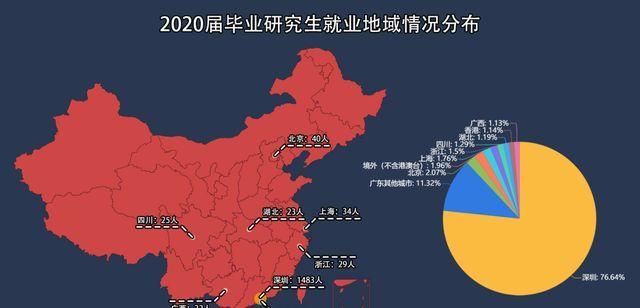读上图,我们再来看看深圳大学2020届硕士毕业生的就业地域情况:深圳大学2020届硕士毕业生共有2164人;其中,在深圳就业(含升学,下同)1483人,占总就业人数的77.84%,广东其他城市219人,占比11.49%;两者合计1702人,占了89.33%。其他地区就业较多的是:北京40人,上海34人,浙江29人,四川25人,湖北23人,香港22人,广西22,国外就业38人。深圳大学的数据,也说明了学校地理位置对毕业生工作地理位置影响还是不小的。