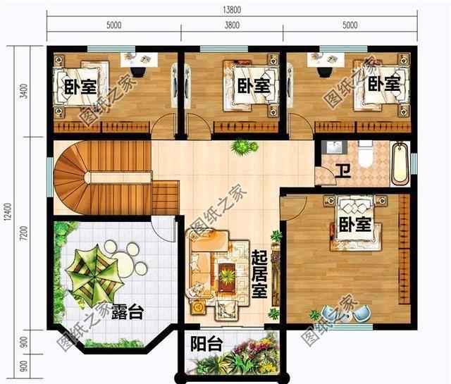 二层户型:客厅、卧室x4、卫生间、露台、阳台;
