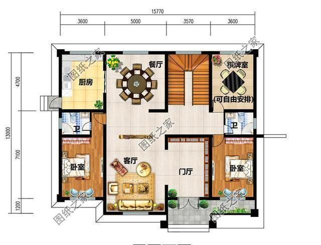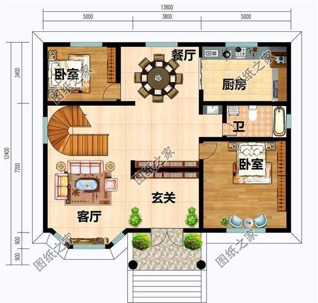 一层户型:玄关、客厅、厨房、餐厅、卧室x2、卫生间;