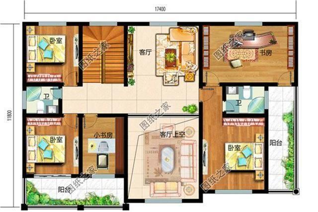 二层户型:客厅上空、客厅、主卧(带卫生间)、卧室×2、书房、小书房、露台×2;