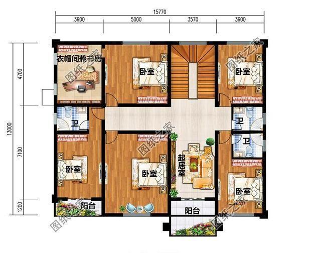 二层户型:休闲厅、主卧(带书房、衣帽间)、卧室(带卫生间)×2、卧室x2、公卫、阳台;