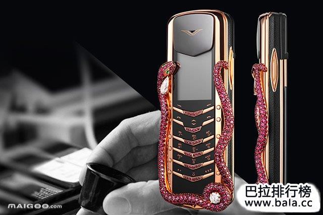 Vertu Signature Cobra眼镜蛇限量版,达到了31万美元(约合人民币198万元左右)天价让人瞠目结舌。Vertu Signature Cobra限量版在蛇身镶有439颗红宝石,眼睛则为两颗祖母绿。全球发行8部,国内仅一部。该手机从制作工艺上而言是无可挑剔的。其每一个零件都由Vertu设计,每部手机包括388个机件,共申请了74项专利保护。并且手机也是全手工组装,嵌满珠宝的键盘由八位设计师共耗费了四年的制作工时完成。