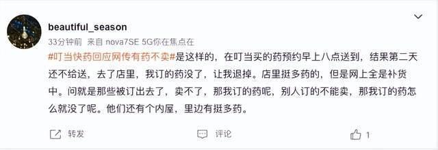 还有网友爆料称,在叮当买的药预约早上八点送到,结果第二天还不给送,去了店里,我订的药没了,让我退掉。