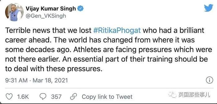 “这是我们家无比悲伤的一刻,Ritika是一位天赋异禀的摔跤手。我不知道她为什么会走到这一步。胜负只是运动员生活的一部分,不是全部。我们永远不该为了胜负这么做…”