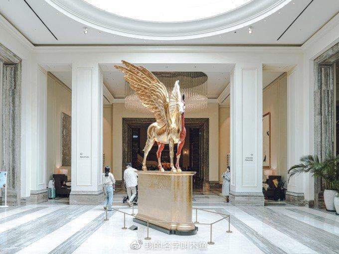 酒店内的每一处设计都有巧思,因为它本身就是一件艺术品。长达120米的三个楼翼设计是它的标志,从进入酒店大堂的那一瞬间开始,大堂中央就是达明•赫斯特 (Damien Hirst)的《Golden Legend》,金色飞马奢华优雅,我们的艺术盛宴也就此拉开了序幕。