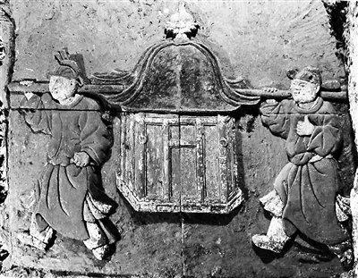陕西宝鸡晚唐五代李茂贞夫妇合葬墓的砖雕图案,今名《二人抬轿图》