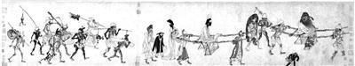 兜子长什么样?高承没有明说,好在我们从南宋末年画家龚开的《中山出游图》里找到兜子。画面上,一群小鬼抬着两副兜子,都是在两根竹竿之间绑一个椅子,乘客坐在椅子上,晃晃悠悠地前行。所以,兜子绝对不是轿子,也不是檐子,而是咱们现代人说的滑竿。