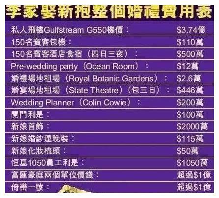 李家诚又花了6亿多元办婚礼,把徐子淇娶进门,看看下面这张局部费用清单。
