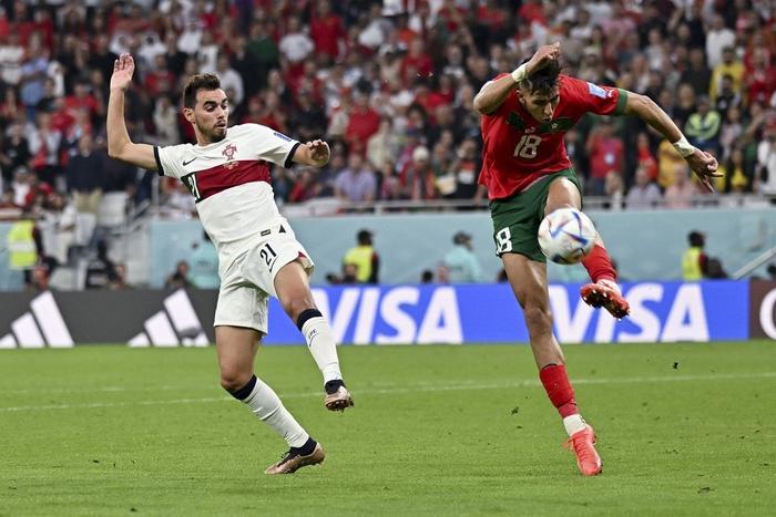 12月10日,摩洛哥队球员亚米克(右)与葡萄牙队球员里卡多·奥尔塔在比赛中拼抢。当日,在四分之一决赛中,摩洛哥队以1比0战胜葡萄牙队。新华社记者肖艺九 摄