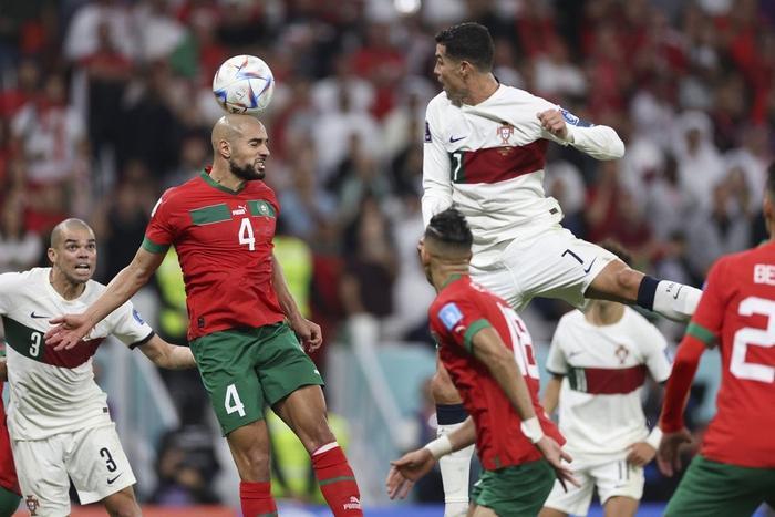 12月10日,葡萄牙队球员克·罗纳尔多(上右一)与摩洛哥队球员索夫扬·阿姆拉巴特(左二)在比赛中争顶。当日,四分之一决赛中,摩洛哥队以1比0战胜葡萄牙队。新华社记者李钢 摄