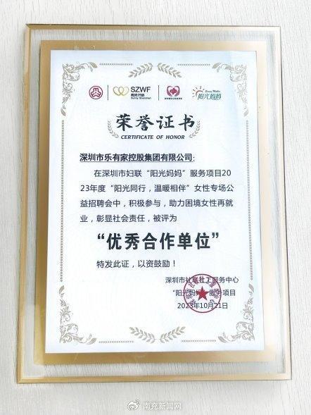 值得一提的是,乐有家在深圳市社联社工服务中心承办的阳光妈妈项目中表现优异,获得了深圳市社联社工服务中心授予的“优秀合作单位”。