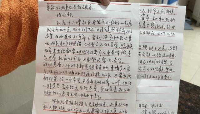 “她们经常来看望我,问我有什么困难,我就发自内心的感谢她们多年来对我的照顾。”近日,温泉街道办事处收到一封手写感谢信,这封信来自十六潭社区90岁高龄的谭婆婆,信中她对温泉街道办事处办事员杜文静、十六潭社区工作人员余姣荣数年如一日的暖心照顾表示感谢。