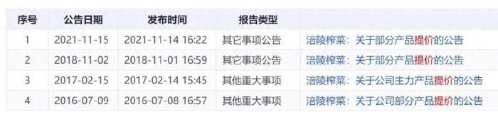 2021年11月,涪陵榨菜再次进行调价,各品类上调幅度为3%—19%不等。