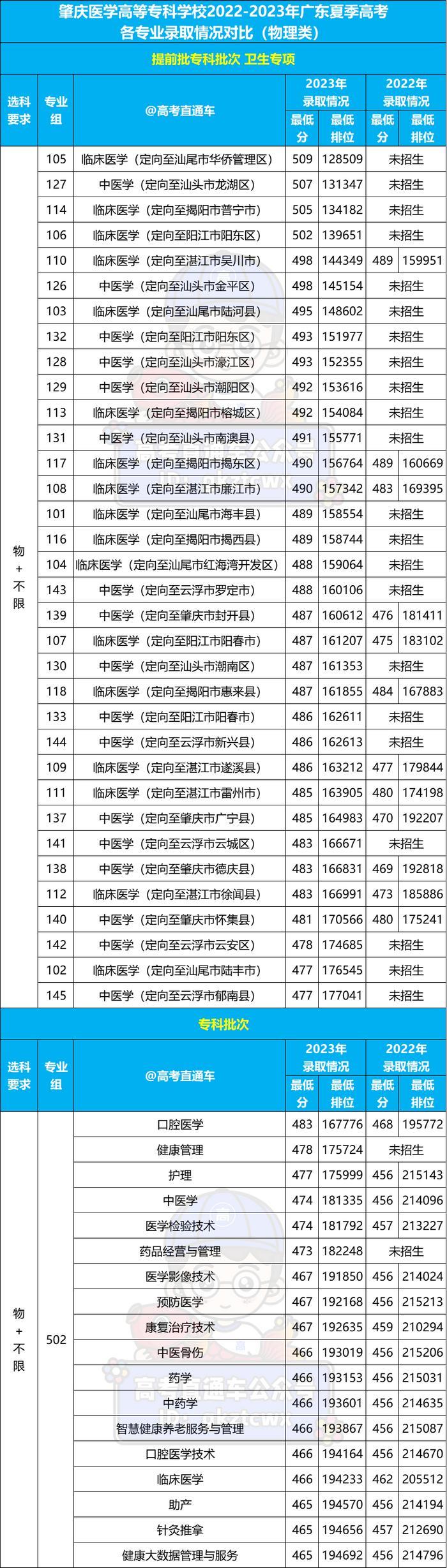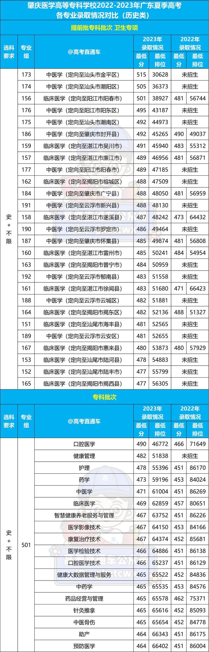 (2)与提前批专科卫生专项一样,学校专科批全部专业录取分也都超本科线。与2022年相比,所有专业的最低录取排位大涨。