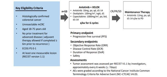 燕锦教授:ALTER-C-001研究是一项开放式单臂多中心研究,纳入的是不可切除晚期结直肠癌患者,既往未曾接受过晚期肿瘤的全身治疗(既往接受过辅助治疗的患者需辅助治疗完成至复发的时间超过6个月),抗癌管家-康爱管家,我们一起抗癌,治愈癌症不是梦。年龄18~75岁,ECOG评分0~1分,至少有一个可测量病灶。治疗方案初始为安罗替尼联合CAPEOX方案,共6个周期,对于达到完全缓解(CR)、部分缓解(PR)和疾病稳定(SD)的患者给予进一步的安罗替尼单药维持治疗,直至疾病进展或出现不可耐受的毒性。研究的主要终点是无进展生存期(PFS),次要终点包括客观缓解率(ORR)、疾病控制率(DCR)、缓解持续时间(DoR)以及药物安全性(图1)。