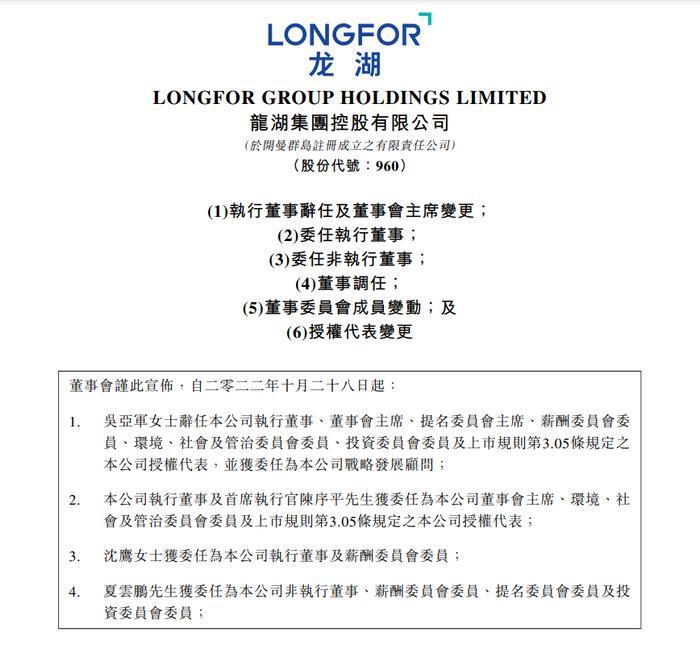 10日28日晚间,龙湖集团公告称,公司创始人吴亚军因年龄及身体原因辞任龙湖集团执行董事、董事会主席,转任公司战略发展顾问;现年40岁的集团CEO陈序平接任董事长职务。