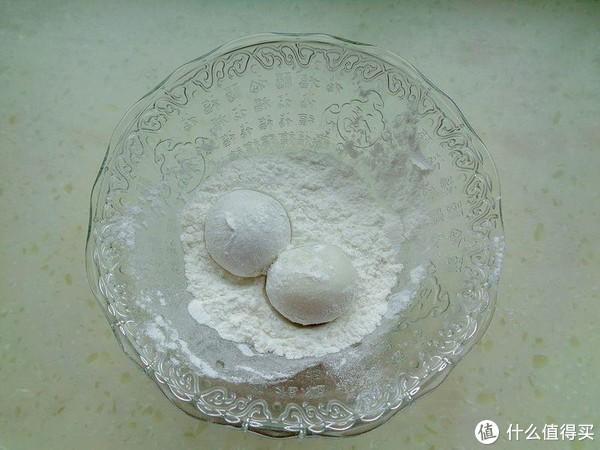 3、把过凉水的汤圆放进糯米粉里滚一滚,最好摇一摇。这样特别的均匀