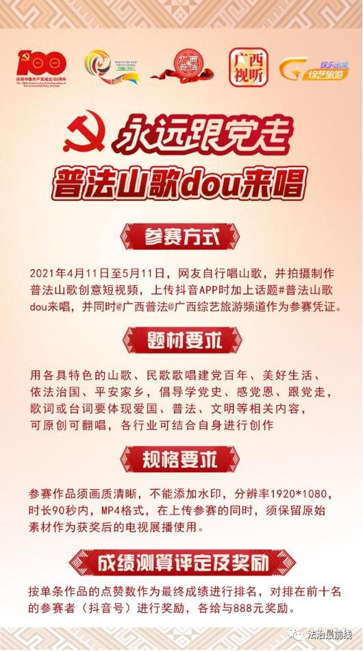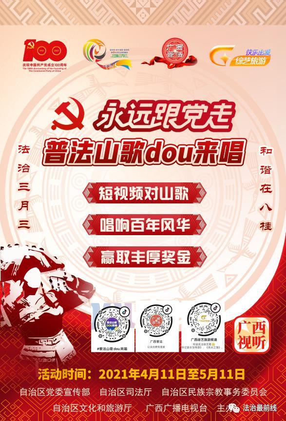 由自治区党委宣传部、自治区司法厅、自治区民族宗教事务委员会、自治区文化和旅游厅、广西广播电视台联合推出的“永远跟党走——普法山歌dou来唱”活动,邀你短视频对山歌,在传统节日里爱国爱党,还能快乐学法普法。