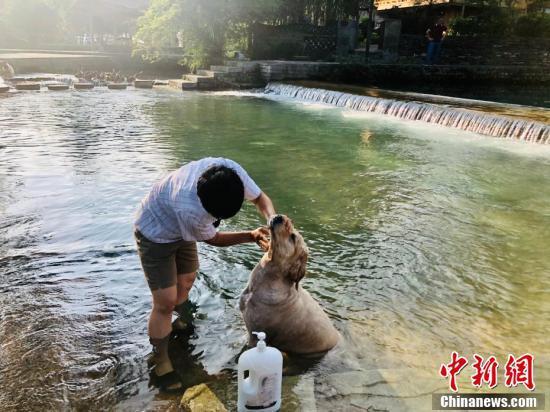 村民在河水中为爱犬洗澡。张伟 摄