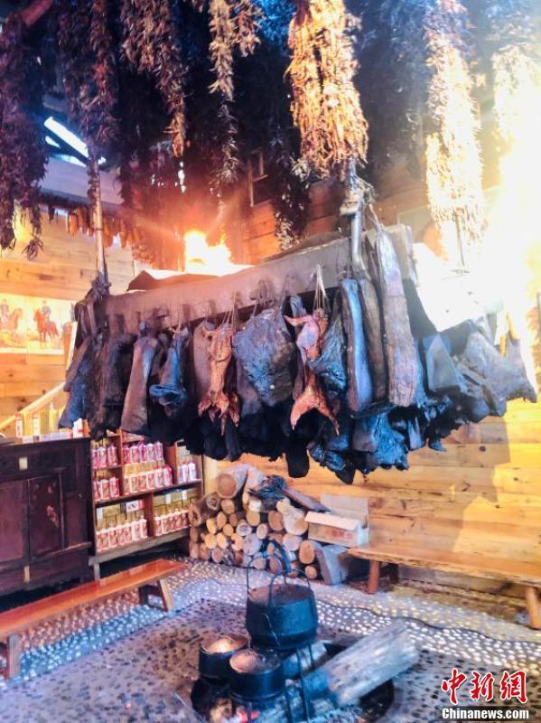云舍村农家乐中悬梁而挂的腊肉等特色美食。张伟 摄