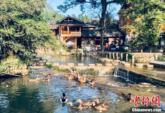 云舍村幸福居客栈前,村民、游客或休憩河边,或水中嬉戏,构成一幅幸福图景。张伟 摄