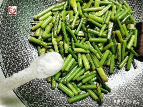 第五步加点料酒:翻炒1分钟左右,加入10毫升料酒翻炒增香,继续翻炒蒜苔2分钟,炒至蒜苔表面皱皮时,加入适量食盐、生抽1勺,快速炒匀给蒜苔调味增鲜。