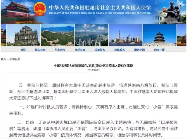 驻越南大使馆官网标示,为有效维权,应及时向中国驻越南使馆提供被索要“小费”的具体情况,如当事官员编号、柜台号和事发具体时间等。