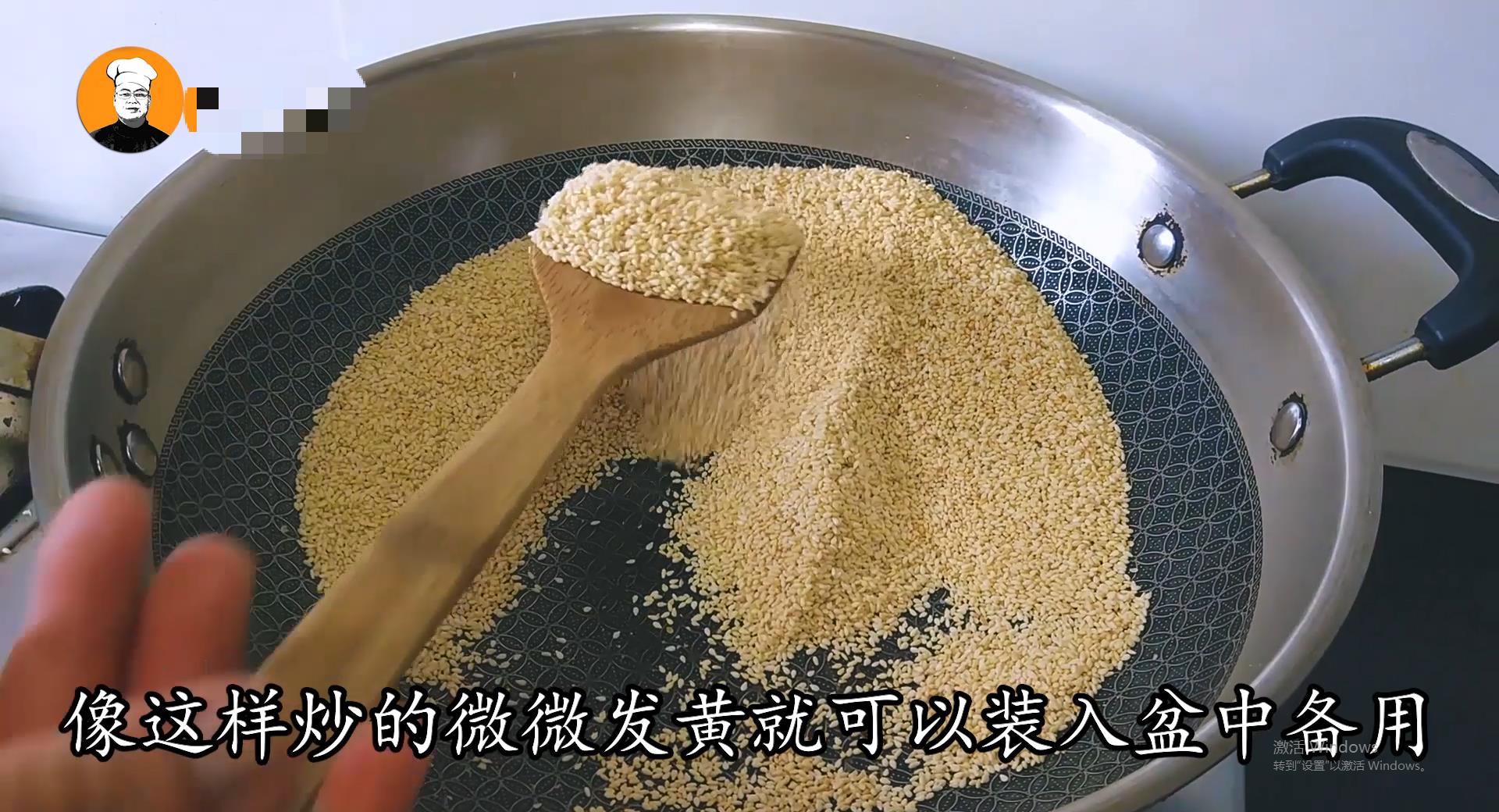4、锅控干后倒入白芝麻,开小火慢慢把白芝麻炒香,用勺子不停的翻炒,像这样炒的微微发黄就可以装入盆中备用