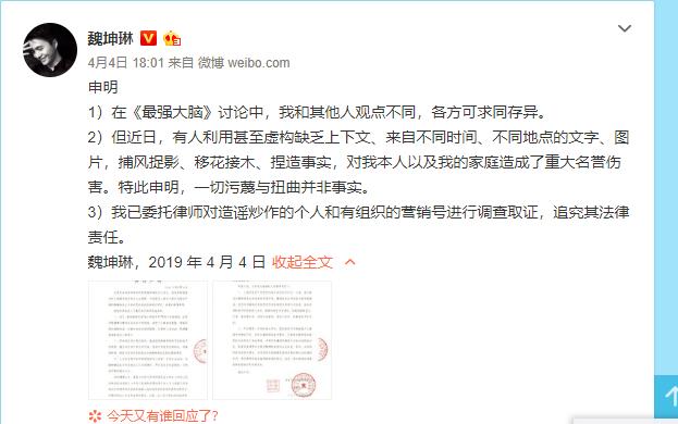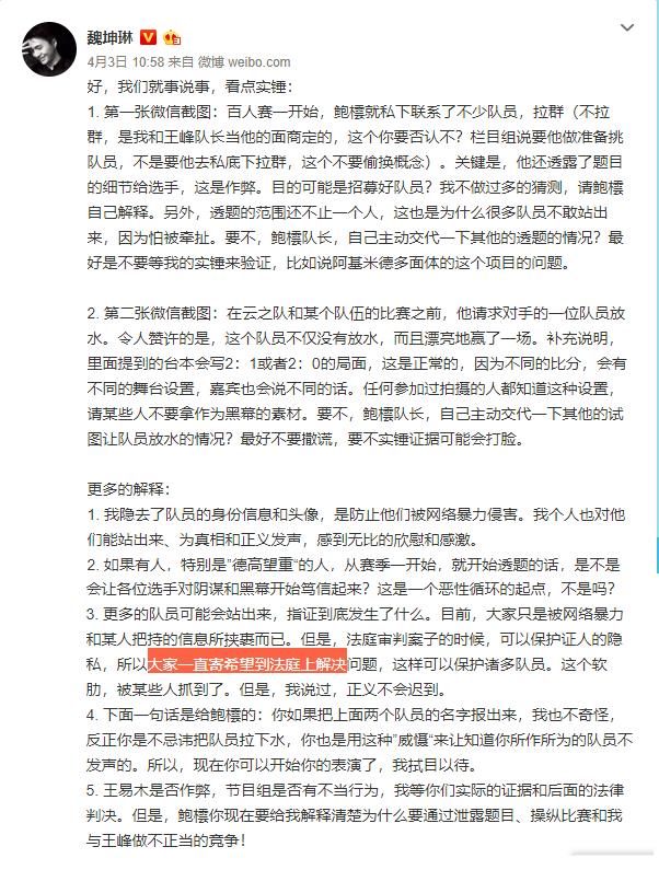 在此前,面对鲍橒和网上舆论就《最强大脑》内幕对自己的指责和质疑,魏坤琳仅仅是发文表达自己的观点,4月3日发文实锤鲍橒,指出鲍橒拉拢队员,泄露题目细节,示意队员比假赛,自己在国际赛拍摄前夕才得知此事。并且提到大家一直寄希望到法庭上解决问题。