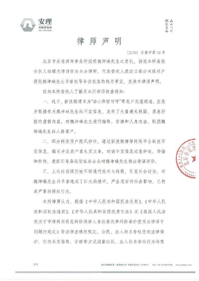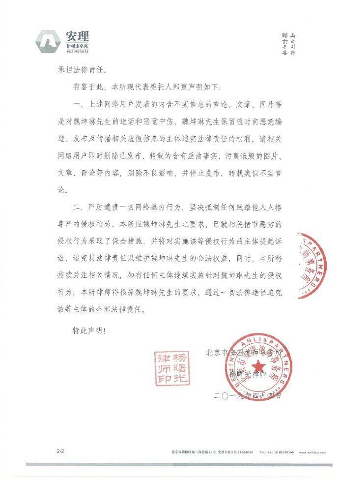 但是此次事件不仅关乎魏坤琳本人,还关系到魏坤琳的妻子——邝霞。邝霞在清华大学工作,和魏坤琳相识于美国留学期间,育有一女,两人经常一起滑雪、攀岩、做各种事情,非常甜蜜恩爱。出轨传言才出现一天,魏坤琳就通过律师事务所发表申明,严厉谴责和申明保留追责权利!至少应该是此事发生后的第一个早晨就对此做出决定,才能这么快核实侵权行为和起草这份申明。从此看得出,在对于家人的问题上,魏坤琳坚决果断,毫不妥协。正如他曾经所说的一样:“在比赛中,科学是我判断的唯一标准;在生活中,快乐是我判断的唯一标准”。