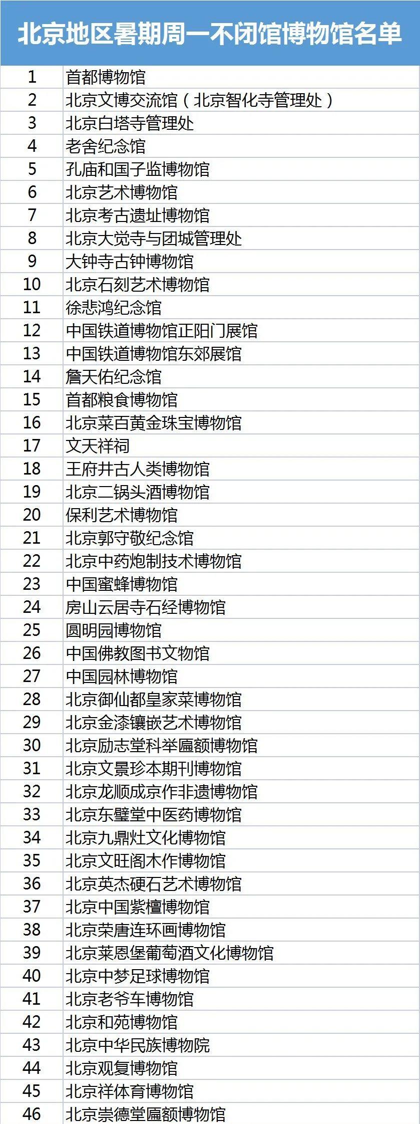 市文物局提示,观众如有在周一参观博物馆的打算,需提前了解该馆开放情况后前往参观。下一步,各博物馆将根据客流、展览内容和观众需求,及时调整预约制度,积极探索适合北京地区博物馆特点和观众需求的延时开放模式,提高观众参观体验,在不妨碍展品“休息”的前提下,让中华文明的瑰宝获得更多展示。46家博物馆一览