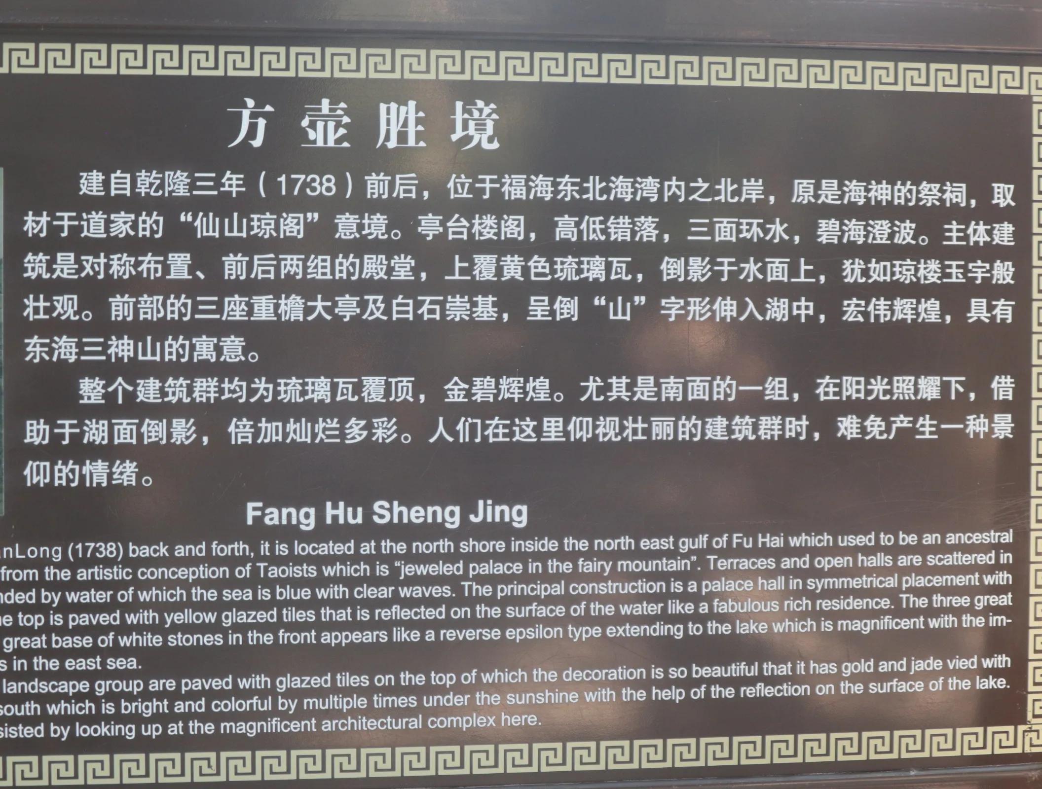 方壶胜境原是海神的祭祠,是我国园林中仅有的一座。它是面临福海东北的一个内湖,大小水面之间,有一座可开启的吊桥作示意性的分隔,当桥开启,大的龙舟可由福海进入内湖,直达突出湖中的迎薰亭。