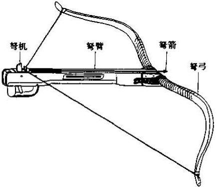 弩是一种装有臂的弓,主要由弩臂、弩弓、弓弦和弩机等部分组成。