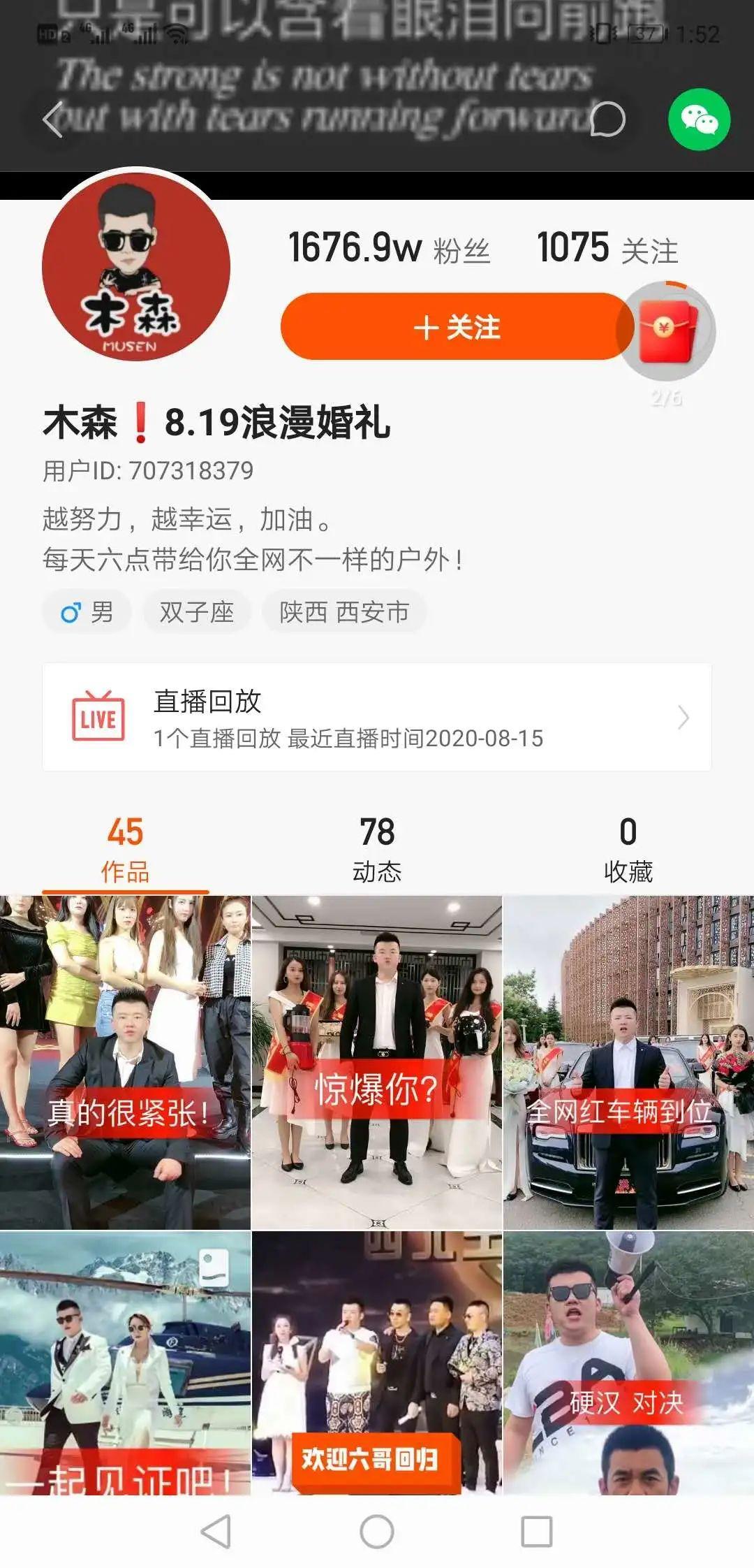 比如最近西安“第一网红”的婚礼就因为婚礼豪华的程度,引发了很多争议,这位网名为“北木森”(又名:木森)的网红,是快手直播平台的一名主播,直播类型是娱乐,从账号发布的内容来看,也大部分是和音乐、娱乐有关。