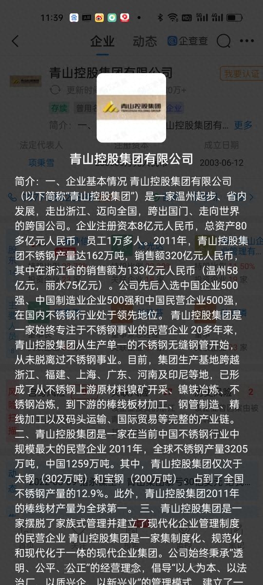 简介:一、企业基本情况 青山控股集团有限公司(以下简称“青山控股集团”)是一家温州起步、省内发展,走出浙江、迈向全国,跨出国门、走向世界的跨国公司。企业注册资本8亿元人民币,总资产80多亿元人民币,员工1万多人。2011年,青山控股集团不锈钢产量达162万吨,销售额320亿元人民币,其中在浙江省的销售额为133亿元人民币(温州58亿元,丽水75亿元)。公司先后入选中国企业500强、中国制造业企业500强和中国民营企业500强,在国内不锈钢行业处于领先地位。 青山控股集团是一家始终专注于不锈钢事业的民营企业 20多年来,青山控股集团从生产单一的不锈钢无缝钢管开始,从未脱离过不锈钢事业。目前,集团生产基地跨越浙江、福建、上海、广东、河南及印尼等地,已形成了从不锈钢上游原材料镍矿开采、镍铁冶炼、不锈钢冶炼,到下游的棒线板材加工、钢管制造、精线加工以及码头运输、国际贸易等完整的产业链。 二、青山控股集团是一家在当前中国不锈钢行业中规模最大的民营企业 2011年,全球不锈钢产量3205万吨,中国1259万吨。其中,青山控股集团仅次于太钢(302万吨)和宝钢(200万吨),占到了全国不锈钢产量的12.9%。此外,青山控股集团2011年的棒线材产量为全球第一。 三、青山控股集团是一家摆脱了家族式管理并建立了现代化企业管理制度的民营企业 青山控股集团是一家集制度化、规范化和现代化于一体的现代企业集团。公司始终秉承“透明、公平、公正”的经营理念,倡导“以人为本、以法治厂、以质兴企、以新兴业”的管理模式,建立了一整套科学完善的法人治理、生产与质量控制、产品销售、产品研发及人事管理等制度。同时,积极承担社会责任,发挥企业公民的带头和表率作用,矢志成为世界知名不锈钢企业。 二、企业主要优势与特点 (一)始终专注于不锈钢事业的拓展与创新 凭着对市场的高度敏锐性和对市场行情的精确把握,20多年来,青山控股集团始终专注于不锈钢事业并成为了当前中国不锈钢领域规模最大的民营企业。当中国众多企业纷纷进军房地产等当时高利润高回报的行业实施多元化经营的时候,青山控股集团从未脱离过不锈钢行业,而是努力在不锈钢领域进行事业的拓展与创新,实现了由单纯的不锈钢钢管加工到镍矿开采、镍铁冶炼、不锈钢冶炼、不锈钢棒线板材加工、钢管制造、精线加工及码头运输和国际贸易等多领域综合经营的转变,力求在不锈钢领域做精、做实、做稳、做强。 (二)高度重视技术研发与创新 青山控股集团拥有当前国内外先进的炼钢、连铸、连轧、穿孔等设备,成功建设了具有国际领先水平的镍铁冶炼、不锈钢熔炼、连铸坯、热轧一条龙生产线,是国际上第一家把不锈钢生产跟RKEF生产工艺流程紧密结合直接生产出不锈钢的企业,也是国内第一家采用RKEF生产工艺生产镍合金的企业。公司先后投入巨资成立了不锈钢研发中心,聘请了特钢冶炼、连铸、压力加工和金属材料等方面的专家,购置了现代化的产品开发和中试设施,建立了一体化的不锈钢研发、中试和精品生产基地。同时,与多家知名科研院所建立了长期不锈钢研发合作关系,掌握了多项不锈钢领域的技术专利。 (叁)实施富有青山特色的人才战略 青山控股集团非常重视人才的引进、培养和使用。从技术人才、管理人才到各领域的优秀人才及专家,青山控股集团都会努力将他们争取到青山队伍中。近几年,为了激励先进,树立典型,吸引人才、留住人才,公司每年都会评选出一批“终身员工”和“终身管理者”,对在公司工作叁年以上,工作表现出色的员工和管理人员授予奖章,并给予社会保险、公司股份、住房优惠、带薪休假、学习深造等方面的特殊待遇。同时,公司每年会派遣部分高层管理人员参加国内外着名院校的EMBA深造、相关专业的学历教育及较高层次的专业技术培训。2011年8月,公司成立了青山商学院,每半年组织50名左右的主要管理人员和骨干参加商学院的系统学习,并花巨资聘请国内外资深教授和老师为每位学员授课,以期建设一支具有青山特色的企业管理人才队伍。