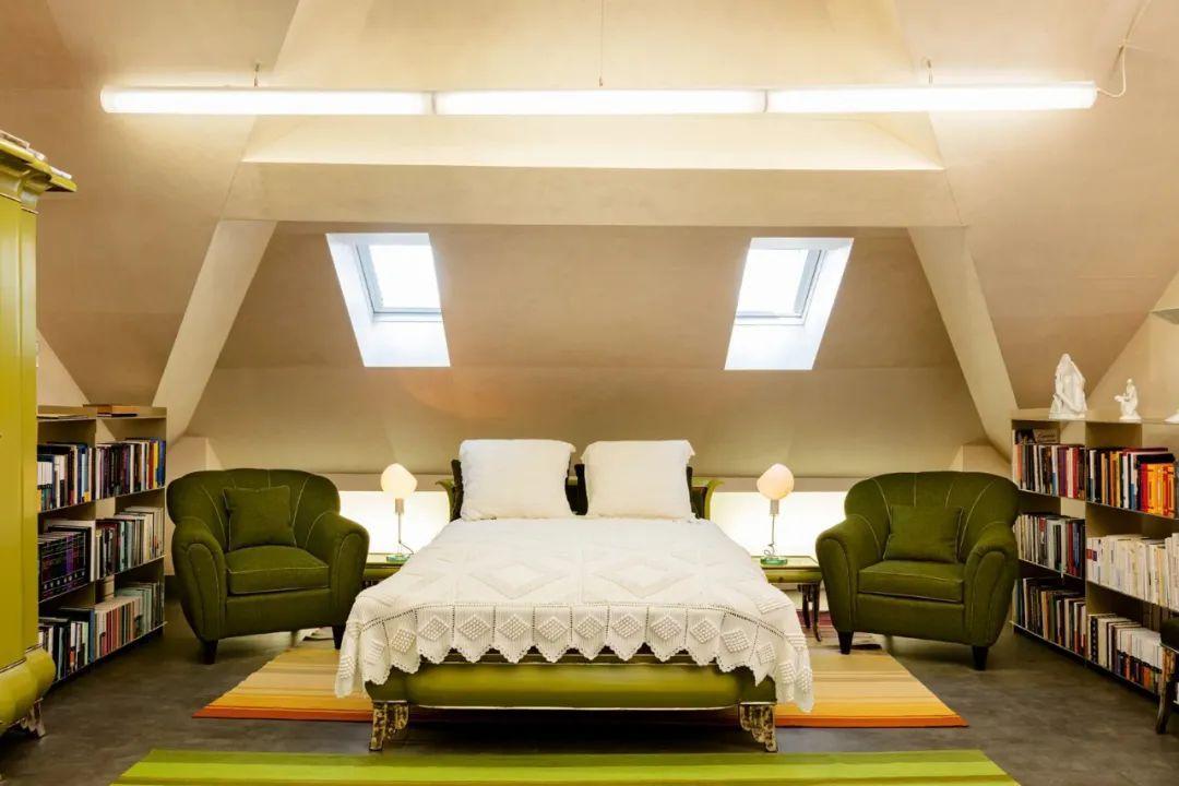 卧室小而美,除了床和沙发,就是书柜。阳光和星空从屋顶的窗户里流淌下来,仿佛阅尽繁华后重归质朴。