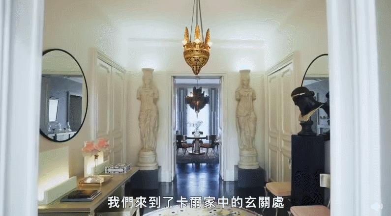 空中挂着1925年法国传奇家具设计师Armand Albert Rateau的镀金镂空吊灯,脚下是编织花纹的圆形地毯,墙上两面黑边圆镜左右对称,老佛爷“复古+摩登”的审美品位彰显无遗。