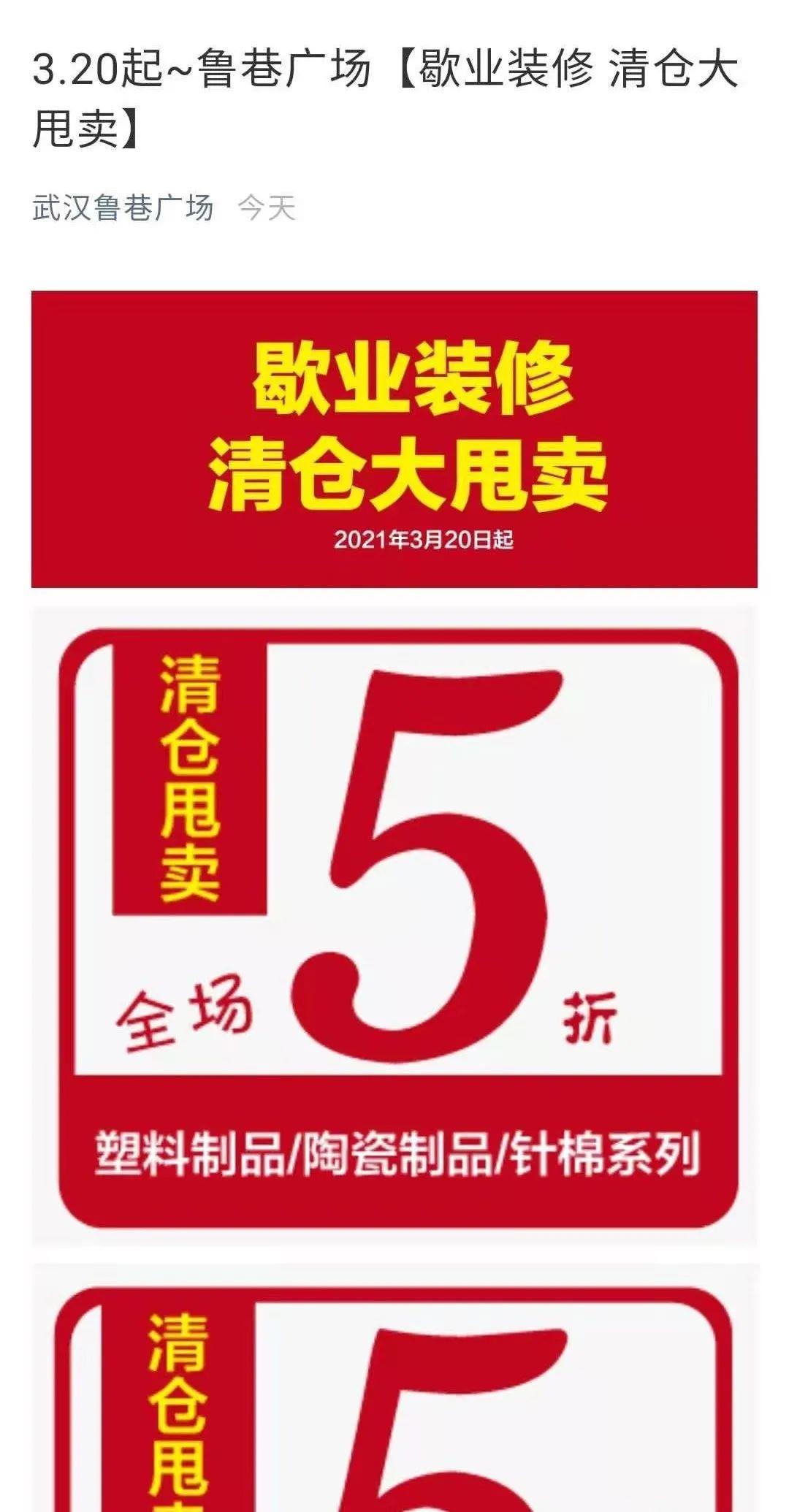 鲁巷广场购物中心负一楼与地铁2号线相连,目前少量门店已关闭,内部也已经清空,或是打出“清仓、甩卖”等字样。3月18日,武汉鲁巷广场官方微信发布“3.20日起~鲁巷广场歇业装修,清仓大甩卖”的消息。