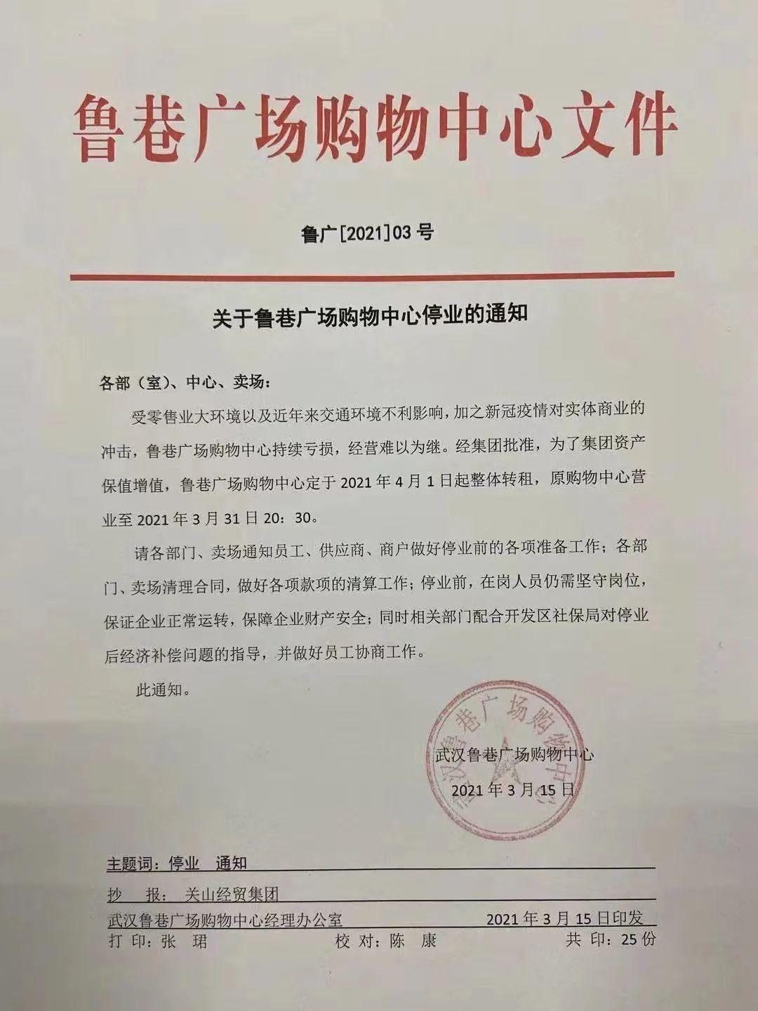据鲁巷广场购物中心发布的官方文件称:受零售大环境以及近年来交通环境不利影响,加之新冠疫情对实体商业的冲击,鲁巷广场购物中心持续亏损,经营难以为继。经集团批准,为了集团资产保值增值,鲁巷广场购物中心定于2021年4月1日起整体转租,原购物中心营业至2021年3月31日20:30。