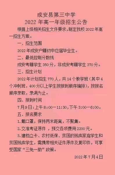 根据市县教育主管部门统一安排,为全面做好高一招生工作,现将招生报名有关安排通知如下: