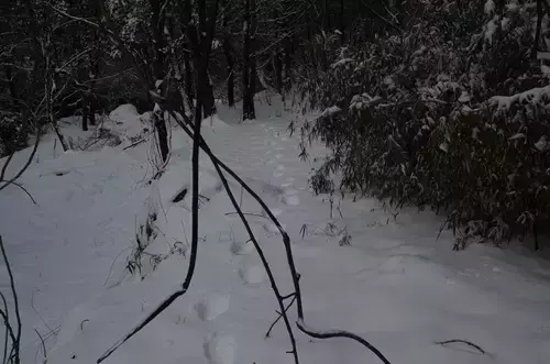 2015年3月份,摩天岭保护站工作人员在野外巡护监测到摩天岭宣鹤亭古道时,发现积雪面上留有清晰的大熊猫脚印。怀着激动和惊奇,跟随野生大熊猫在积雪中留下的脚印,沿途发现多处有大熊猫采食休息的痕迹,且每隔一定的距离,在高大的乔木树根有大熊猫排泄过的尿液。