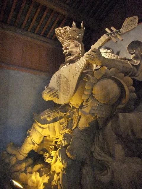 四大天王有站像,有坐像,坐像上脚下都踩着一个小鬼,小鬼的表情狰狞恐怖,一般都是三个男鬼一个女鬼。有人说四个小鬼代表的是酒色财气,也有人说他们是魑魅魍魉。姑且通称为坏人邪念吧!