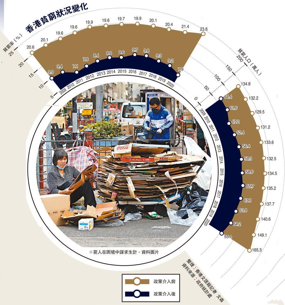 根据香港特区政府2021年11月10日发布的《2020年香港贫穷情况报告》显示,香港贫穷人口“井喷式”增至165.3万人,较2019年多16.2万人,即接近每4人就有1人活在贫穷线下,为有记录以来最高。
