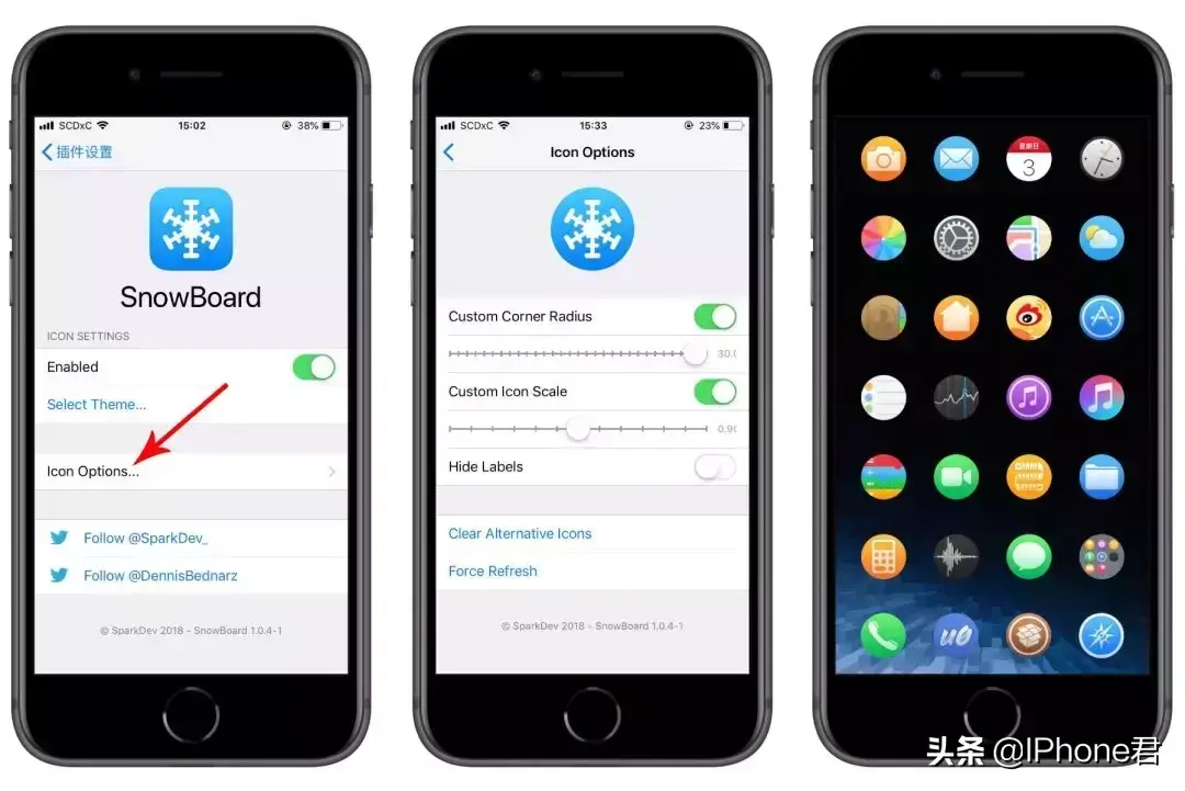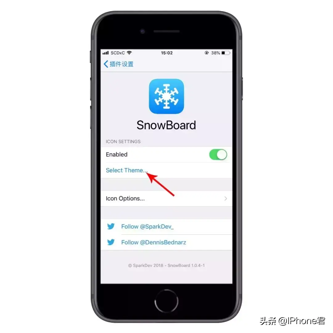 安装完 SnowBoard 之后,再进入 Cydia 搜索「Felicity」主题进行安装。打开【设置】-【SnowBoard】,Enabled 为开启状态,点击【Select Theme...】: