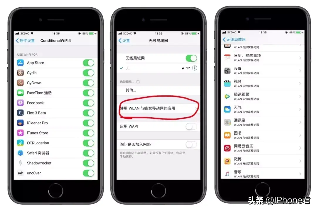 越狱之后某些插件可能会造成新安装的 APP 无法跳出联网权限,这时候可以先使用 ConditionalWiFi4 插件打开 Wi-Fi 连接权限,再进入【设置】-【无线局域网】-【使用 WLAN 与蜂窝移动网的应用】打开蜂窝移动网权限