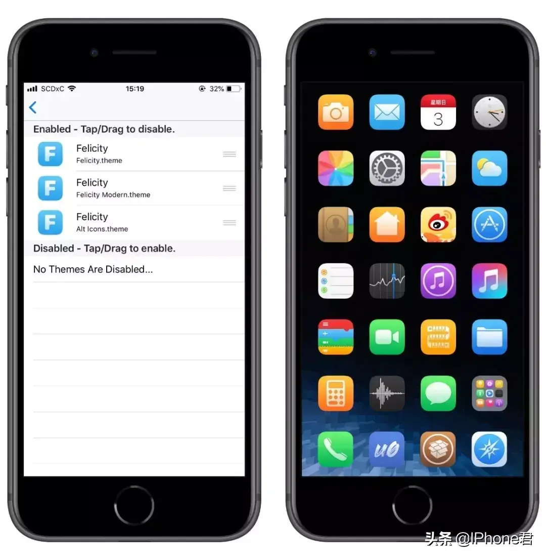 通过点击或拖拉将需要更换的主题放置在 Enabled 列表之下(不同主题请不要混用),此时再返回桌面就能看到主题生效:
